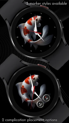 Immerse yourself in the charm and vibrancy of Japanese culture with this captivating design featuring mesmerizing koi fish, symbolizing resilience, determination, and the pursuit of dreams. The koi fish's vibrant red and white hues add a touch of elegance and energy, beautifully complemented by the serene black background. Explore 10 background variations with colorful koi fishes, each providing a unique visual experience. Choose between traditional hour markers, sleek numerals, or minimalist dots for effortless time reading. Elevate your timepiece with two complication options and personalize these complications with four background choices. Immerse yourself in the perfect blend of functionality and style with this exceptional timepiece.