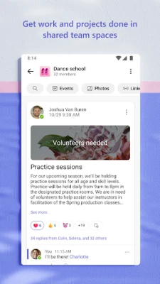 • Work closely and collaborate by keeping conversations organized by specific topics and projects with teams and channels.